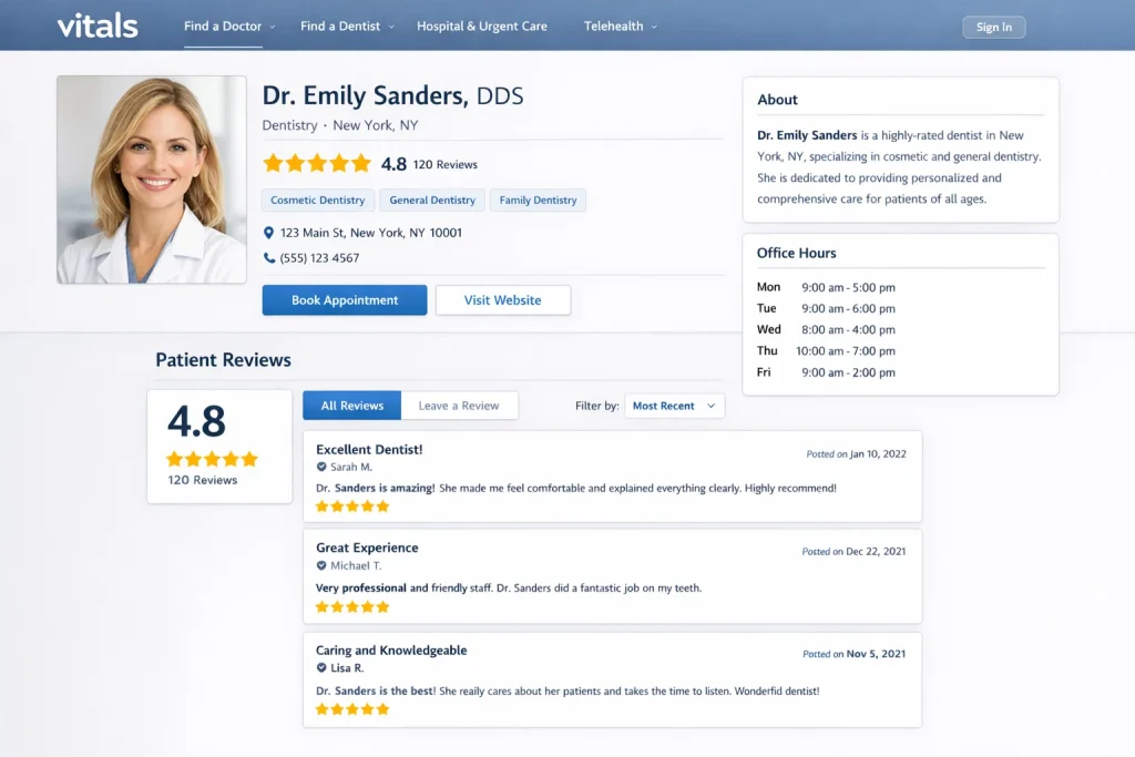 Vitals focuses on doctors and healthcare providers. It often shows ratings and basic details in a clear way. It can help patients who want a quick comparison.