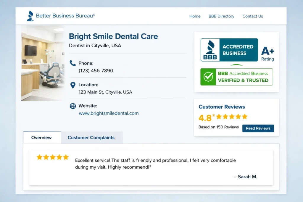 The BBB feels official to some patients, especially older ones. It can help you handle complaints in a structured way. Even a simple profile can add trust.